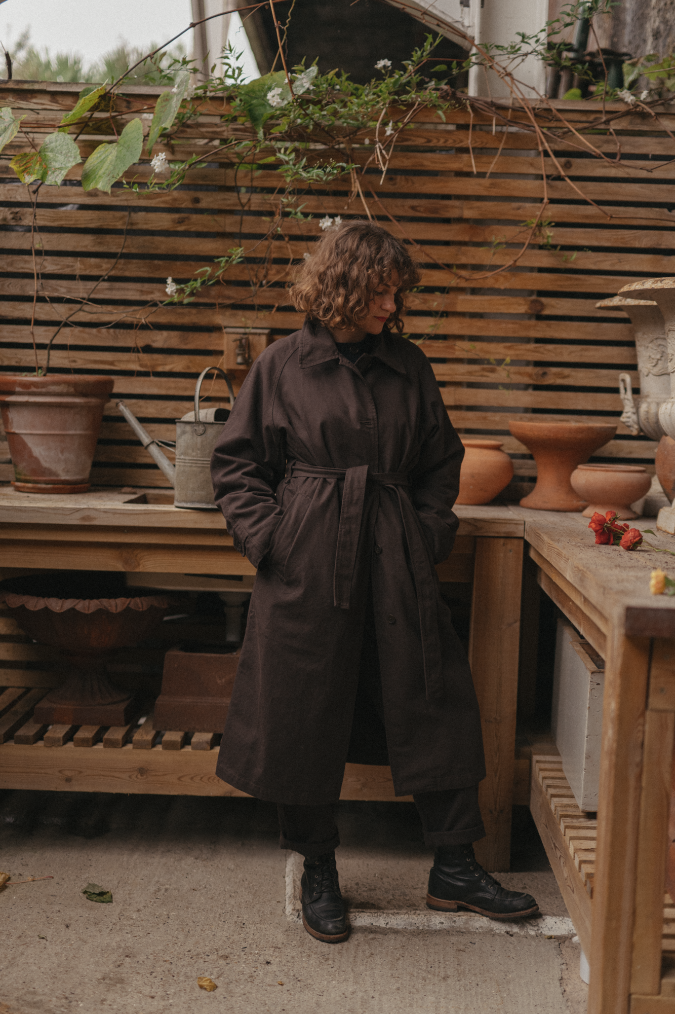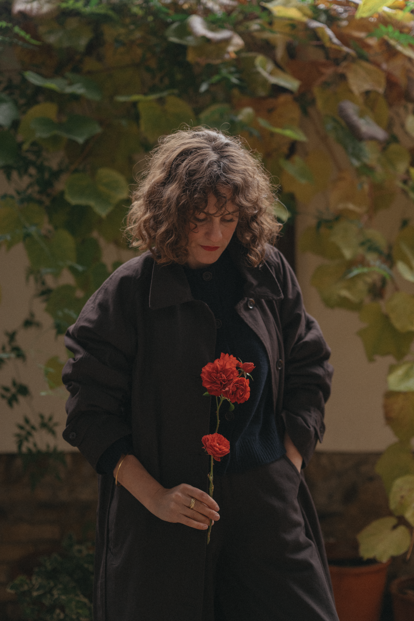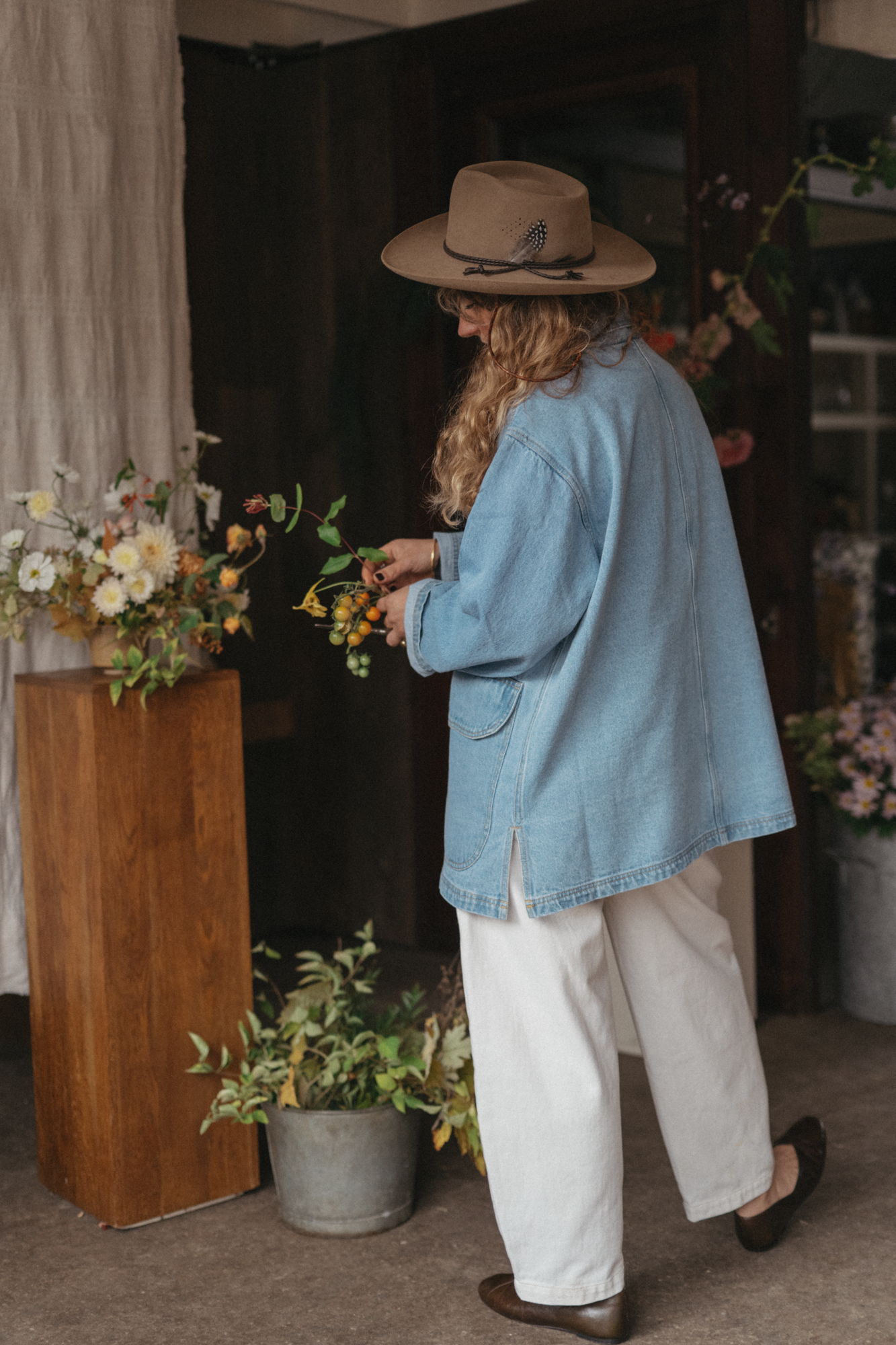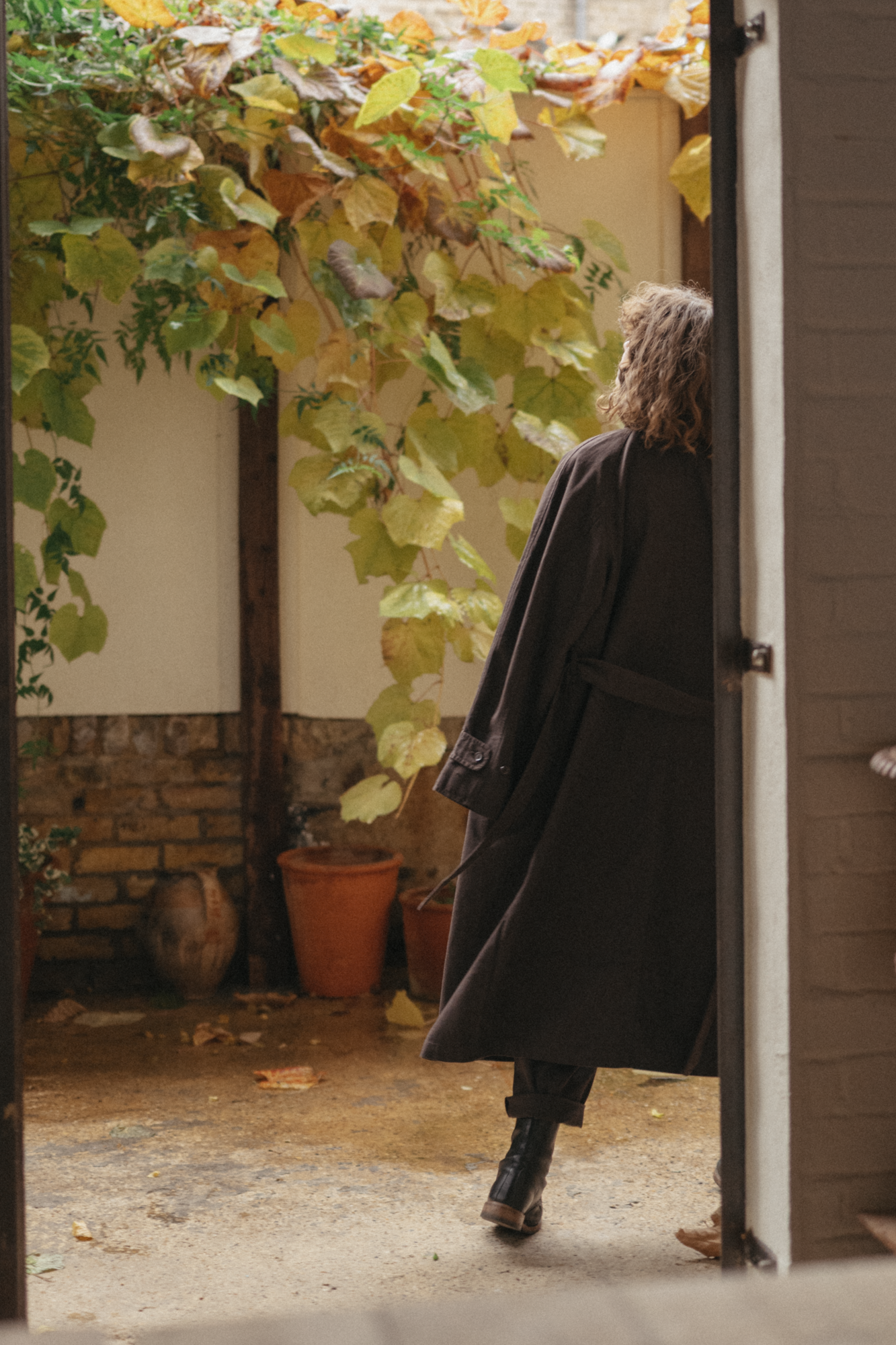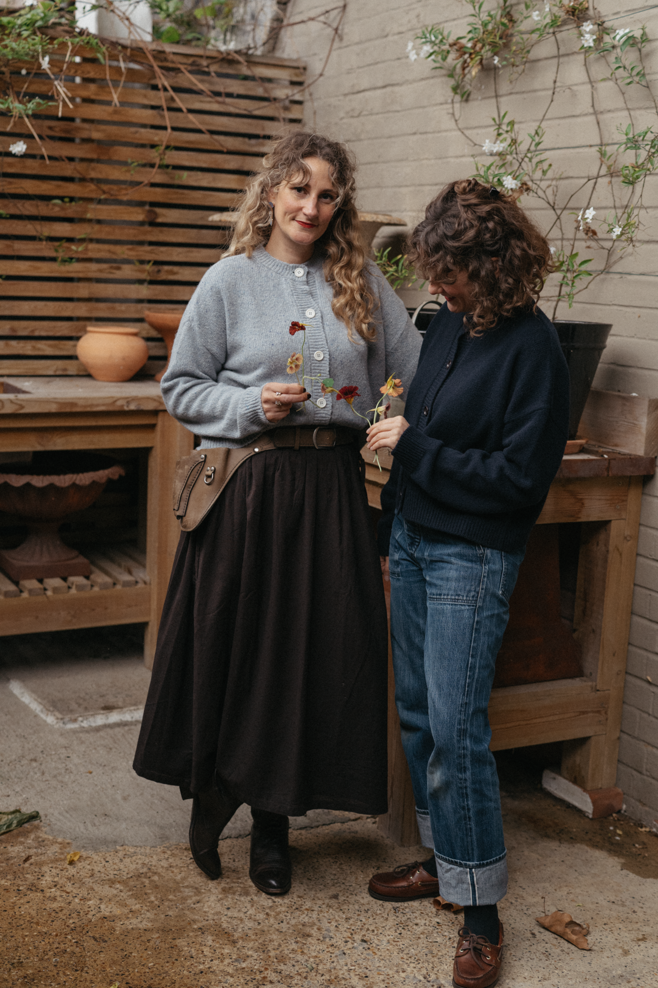 It depends where we are; in the garden we wear workwear. Comfortable, practical pieces in cotton drill or corduroy - overalls, men's shirts, denim, good sturdy boots, leather toolbelts. In London we can have a bit more fun / dress up a bit more. Jess is often wielding a camera or two so she always likes to be super comfortable. I've been living in your Giséle donegal Cardigan in cornflower, it's such a beautiful blue and the perfect oversied, cropped shape so I can already tell that's going to become a part of my winter uniform!